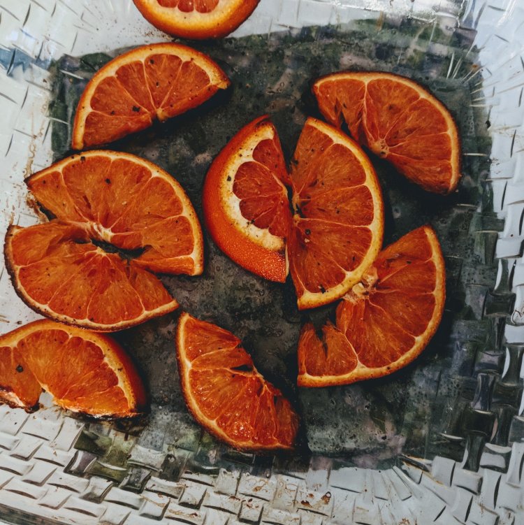 As luck would have it, the grocery store had oranges on sale so I bought a bag. At home, I preheated my oven to 425 and sliced an orange into half-rounds. I placed them in a baking pan, drizzled them with olive oil, and seasoned them with pepper and a generous amount of salt.
